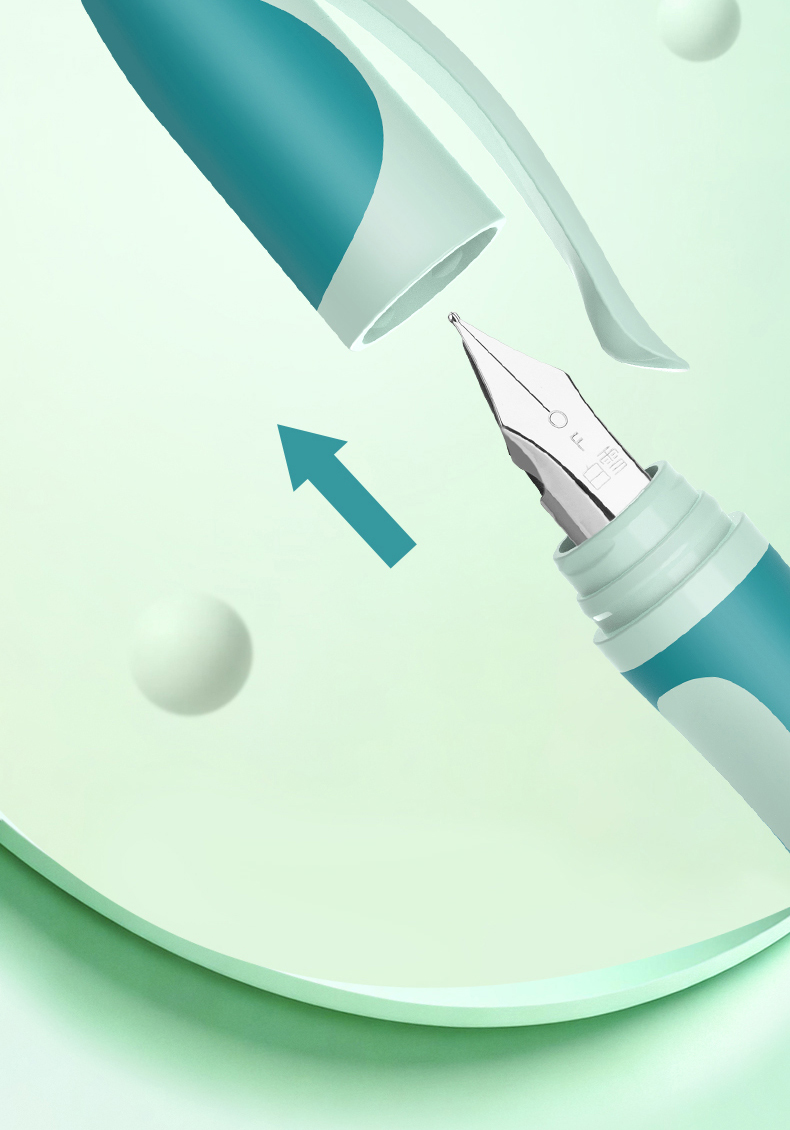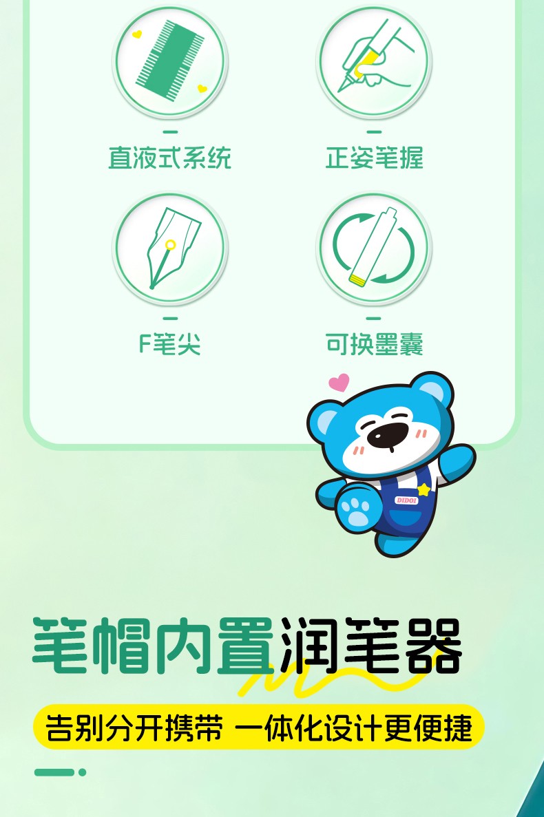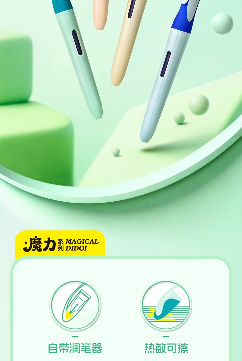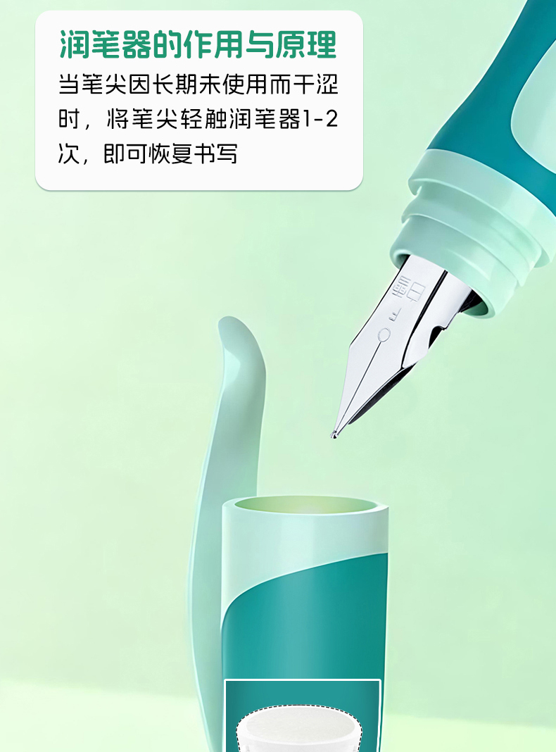 笔帽外侧自带热可擦橡皮,内置润笔器