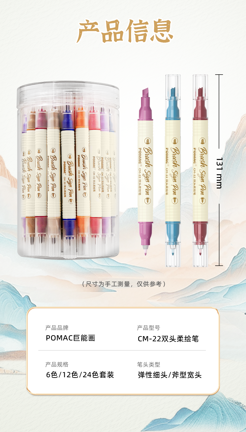 笔头规格:软笔头/斧型笔头产品包装:24色/桶、12色/袋、6色/袋