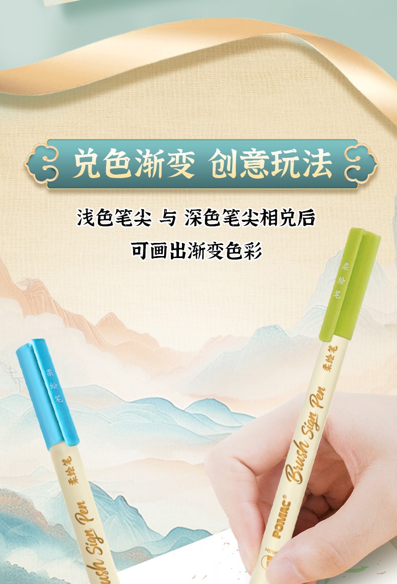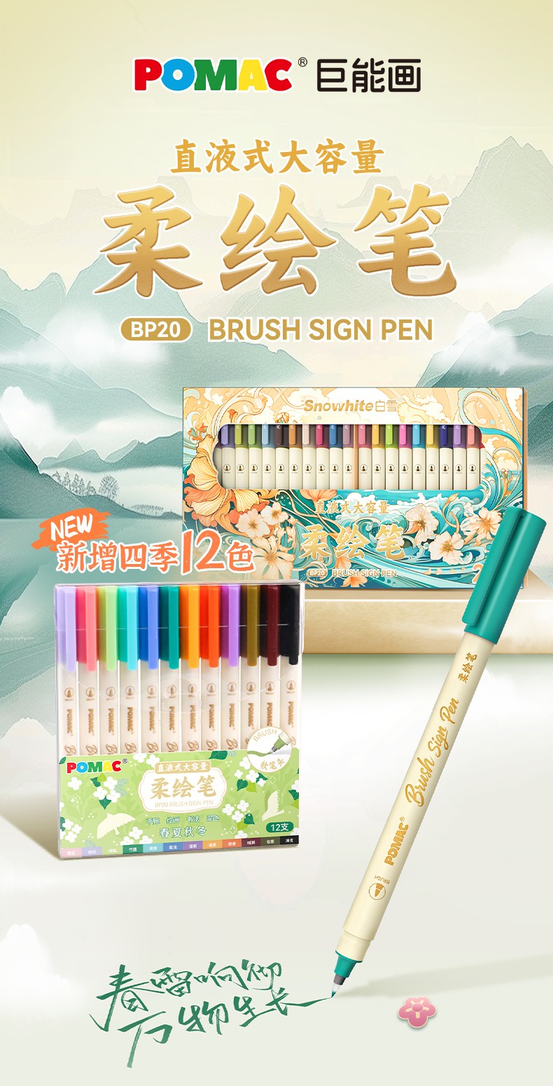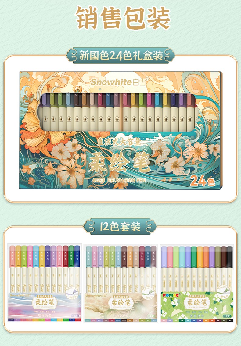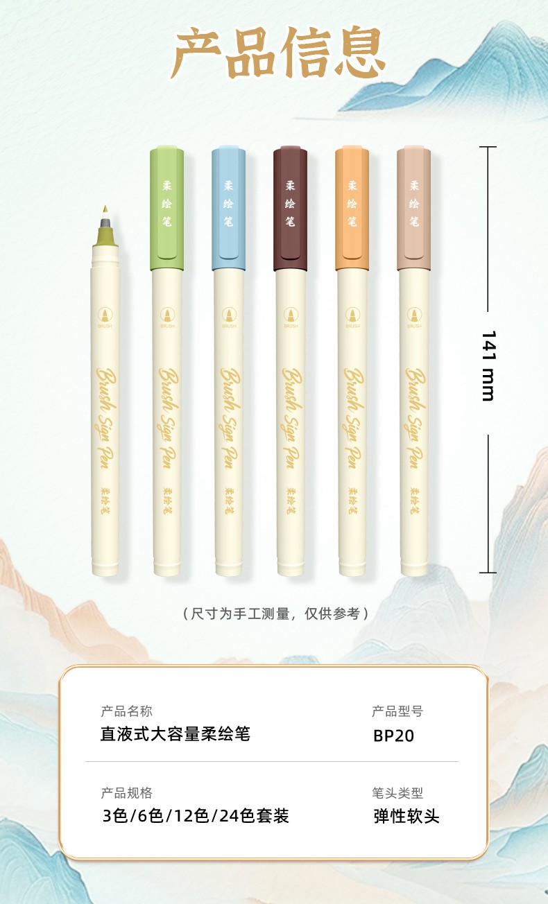 产品型号:BP20墨水颜色:青衫、桃夭、紫薄汗、豆蔻、碧山、云门、麒麟褐、琥珀、沉香、荔色、搪瓷蓝、烟堇、初荷红、涧石蓝、栀子黄、凝夜紫、青莲、渥赭、珊瑚赫、翡翠绿、青金石、缙云、缃色、翠缥、绣球、樱花、柳绿、雨青、靛夜、竹露、葵黄、橙香、槿紫、松墨、暖褐、澜夜笔头规格:弹性软头产品包装:3色/6色/12色/24色